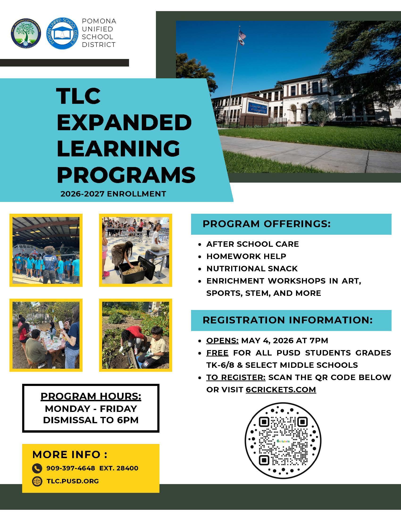 The TLC Program offers after-school care, homework help, nutritional snacks, and enrichment workshops in art, sports, and STEM, with even more opportunities available. Registration opens May 4, 2026, and the program is free for all PUSD students in grades TK–6/8 and select middle schools. Scan the QR code to register.